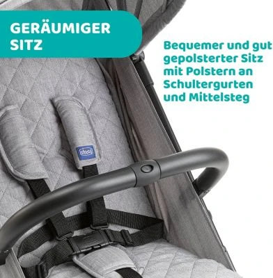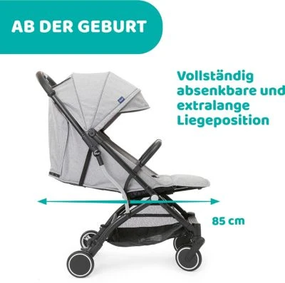 Dieser Sportwagen ist so praktisch wie ein Koffertrolley, einfach mit einer Hand zusammenklappen und hinter sich herziehen! Der geräumige, komfortable Sitz mit Schulterpolstern und gepolstertem Mittelsteg bietet kleinen Weltentdeckern ab der Geburt bis zu einem Körpergewicht von 15 Kilogramm ein gemütliches Plätzchen. Die Rückenlehne lässt sich vollständig absenken und kann stufenlos befestigt werden.