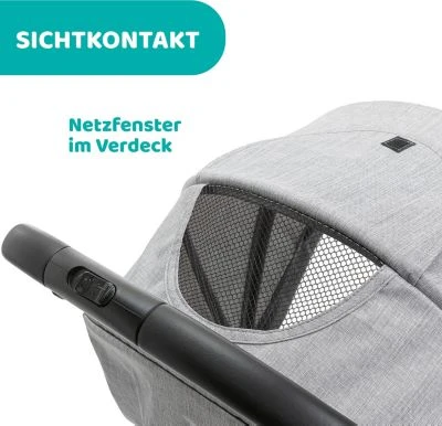 Dank verstellbarer Fußstütze kann eine Liegefläche von 85 Zentimetern Länge geschaffen werden. Das Verdeck ist mit einem Netzfenster für gute Sichtbarkeit und Luftzirkulation ausgestattet. Der besondere Clou: der innovative Frontbügel lässt sich in der Mitte öffnen, für besonders leichtes Ein- und Aussteigen.