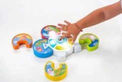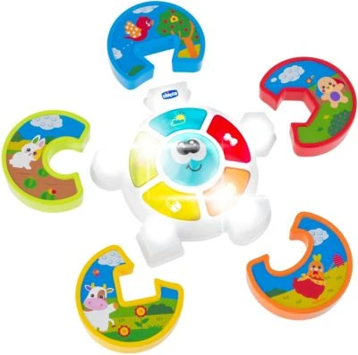 Das bunte Steckspiel von Chicco begeistert die Kleinen ab zwölf Monaten mit Licht- und Soundeffekten. Steckspiel Elektronisches Puzzle „Errate das Tier“ von Chicco 6 Teile mit Licht- und 12 Soundeffekten bzw. Melodien Batterien (3xAAA) im Lieferumfang enthalten ab 12 Monaten geeignet Wird das nette Gesicht in der Mitte des elektronischen Puzzles gedrückt, startet das Lichterspiel mit einer lustigen Melodie. Sobald das Licht auf einer der fünf bunten Flächen stoppt, muss das Kind das Puzzleteil mit dem passenden Tier finden und an das richtige Puzzle-Element anstecken. Wird das richtige Stück angesteckt, gibt das Spiel den passenden Tierlaut wieder. Sobald das Puzzle fertig ist, aktiviert das Spiel verschiedene Lichter und lustige Melodien. So werden spielerisch die Feinmotorik, das Form- und Farbverständnis sowie das Verständnis für logische Zusammenhänge der Kleinen gefördert.
