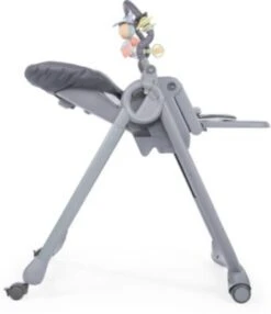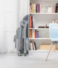 Geschlossen ist Polly Magic Relax sehr kompakt und bleibt alleine stehen. Die Tischplatte lässt sich hinten am Gestell befestigen. Dank der 4 praktischen Rollen kann der Hochstuhl leicht verschoben werden.