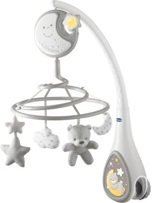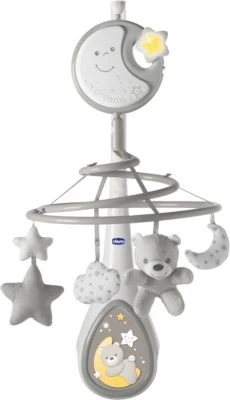 Die an einer sich bewegenden Spirale aufgehängten Figuren (ein süßer Teddy, eine Wolke, ein Mond und Sterne) begleiten das Baby ins Reich der Träume, während es zu beruhigenden Klängen und einem sanften Nachtlicht einschläft.